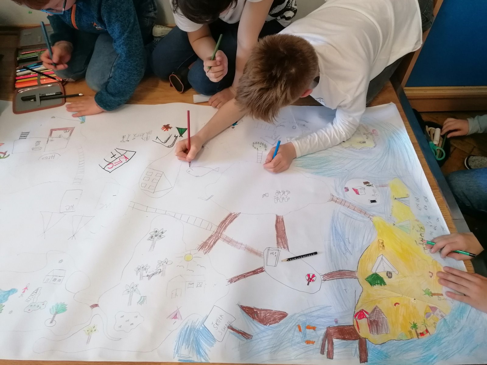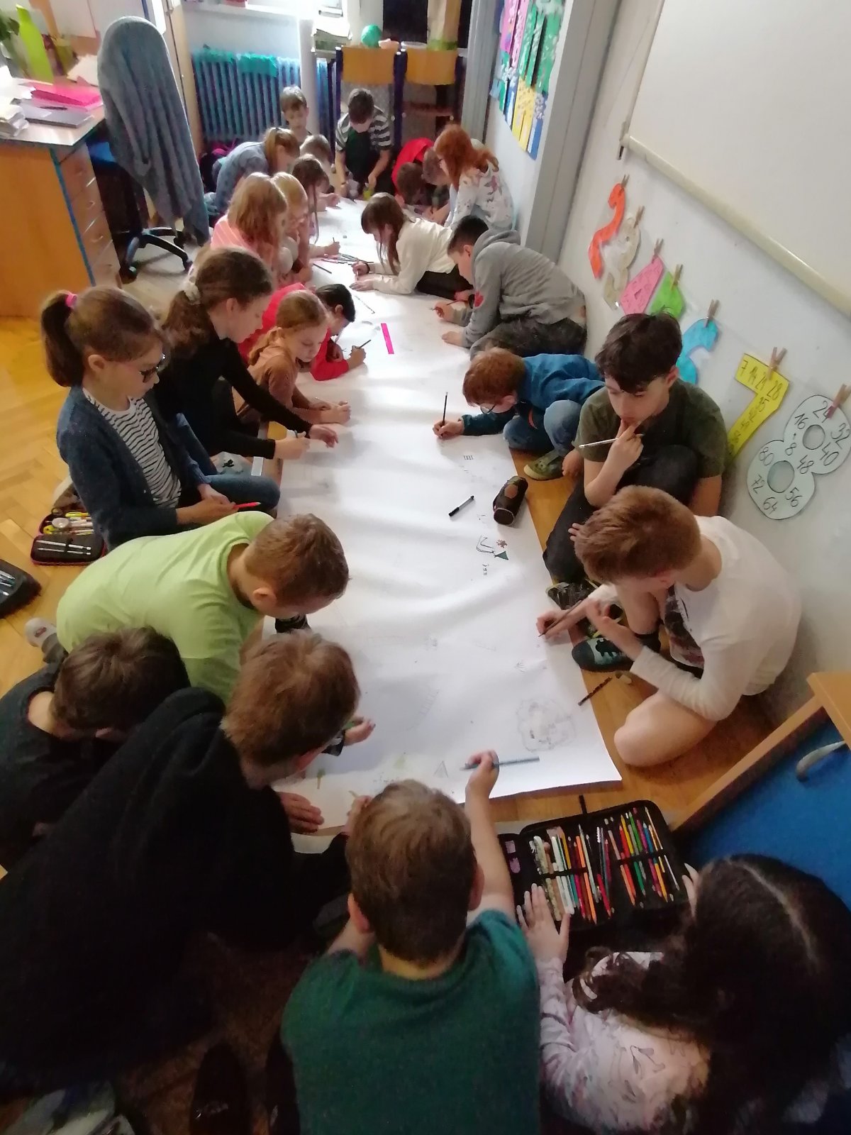 Žáci 3.A pracovali v poslední třídnické hodině na společném výtvoru. Jednalo se o aktivitu „Ostrov“, kdy děti dostaly jedinou instrukci: jejich třída je jedna velká skupina, která ztroskotala u opuštěného ostrova. Následně děti dostaly dlouhý pruh čistého papíru, na který měly za úkol nakreslit svůj společný ostrov. Beze slov. Mile mě překvapilo, že opravdu každé dítě si našlo „své“ místečko u papíru. Při této činnosti se děti učily spolupracovat (beze slov) a měly možnost pracovat na společném projektu. Zároveň se tak podařilo vytvořit dětem prostor pro společnou tvorbu a zážitky. Děti byly nadšené a těší se na další z aktivit, pomocí kterých rozvíjejí své schopnosti komunikace a spolupráce. Třídnické hodiny mají tedy své opodstatněné místo ve vzdělávání dětí, a to zejména při budování žádoucích vztahů v kolektivu a neomezují se tak pouze na organizační a provozní záležitosti.