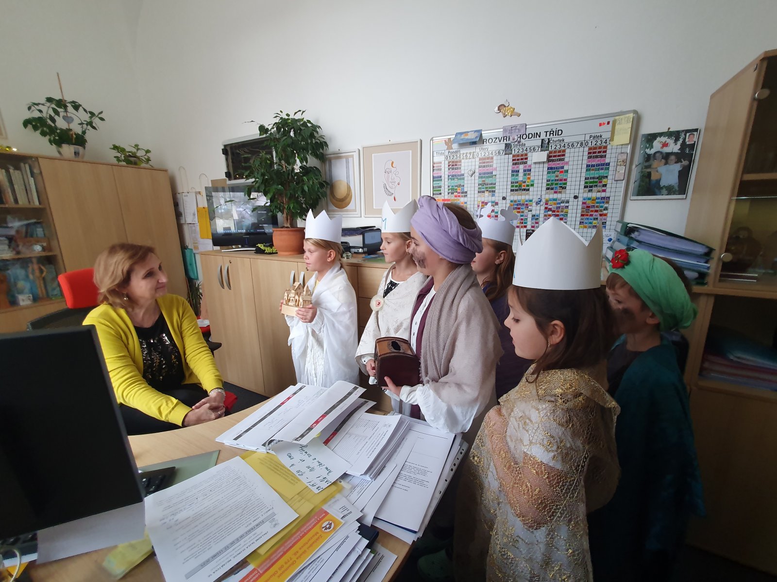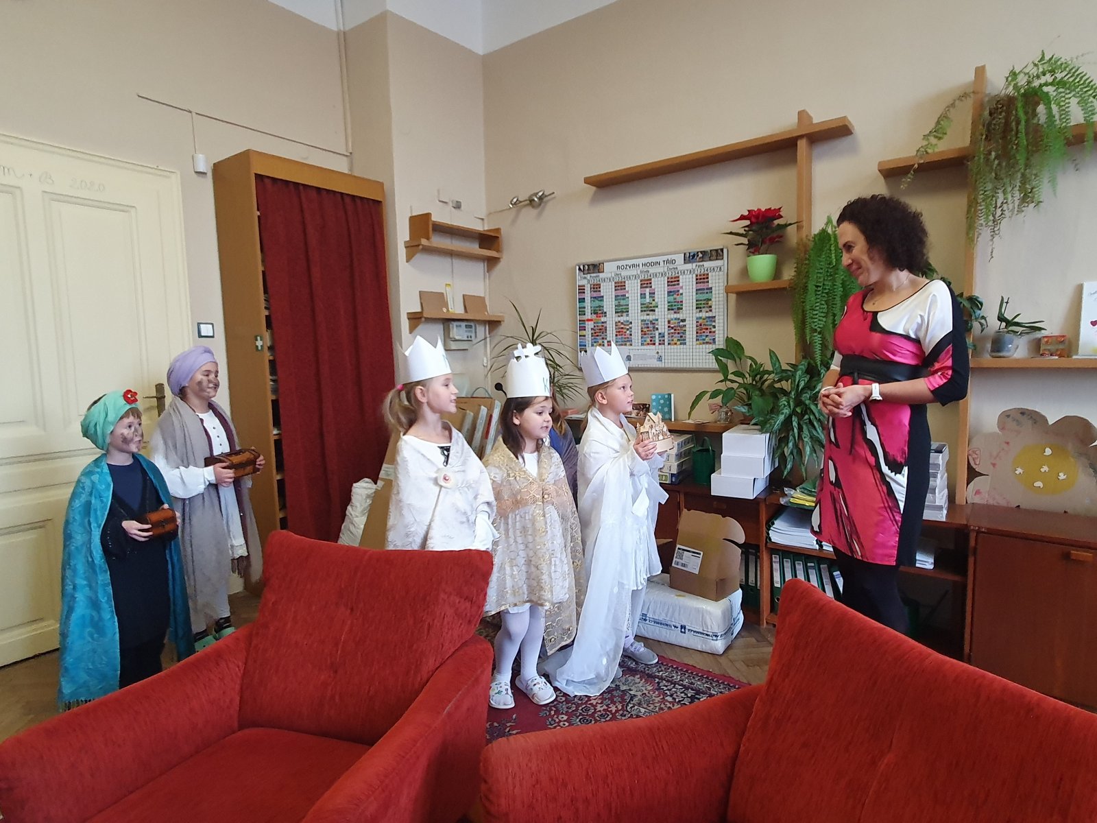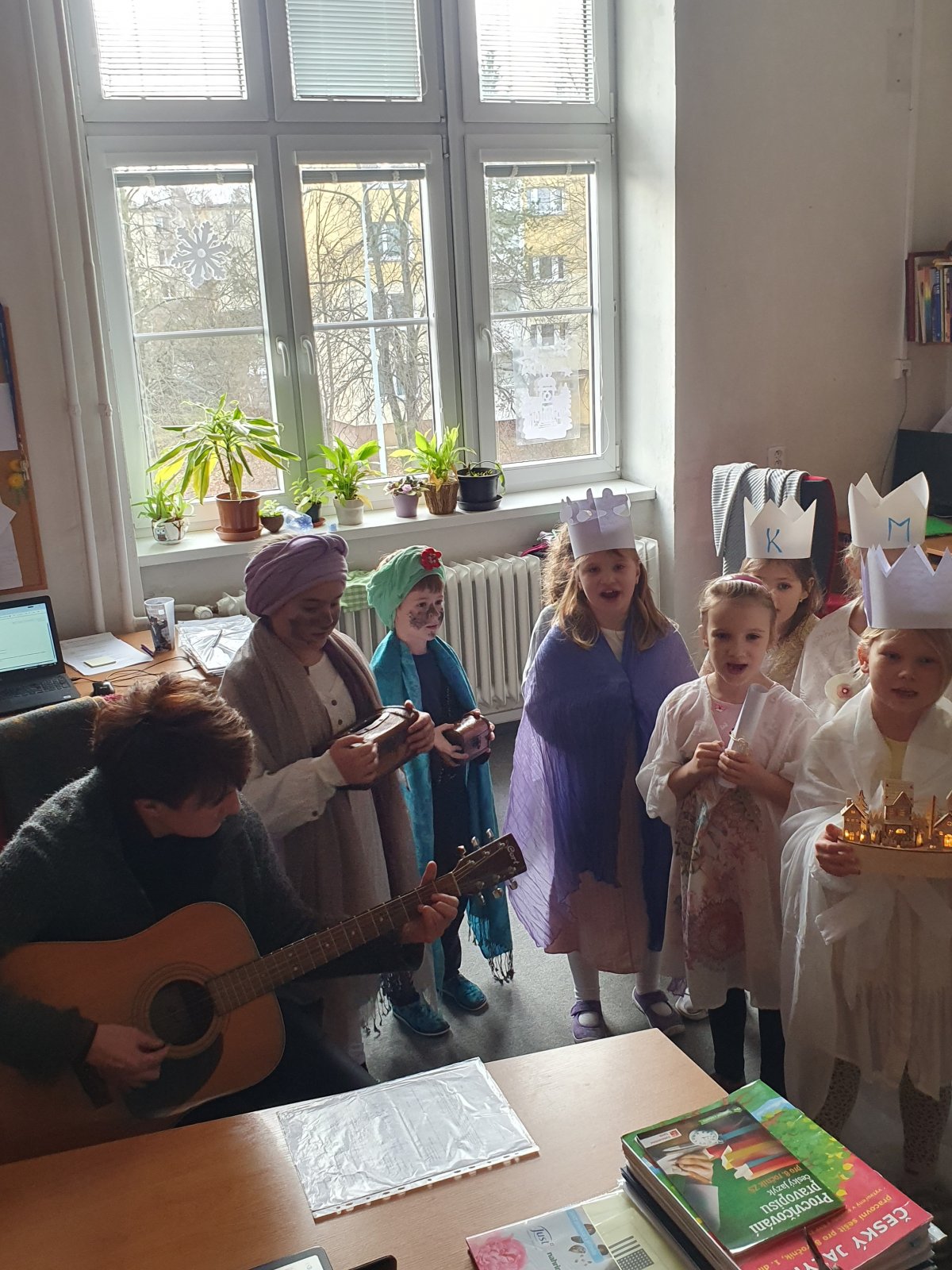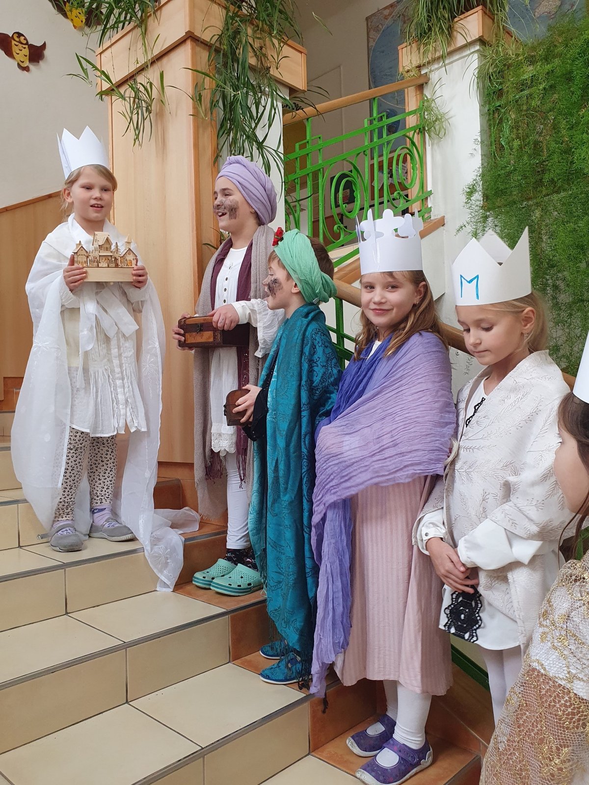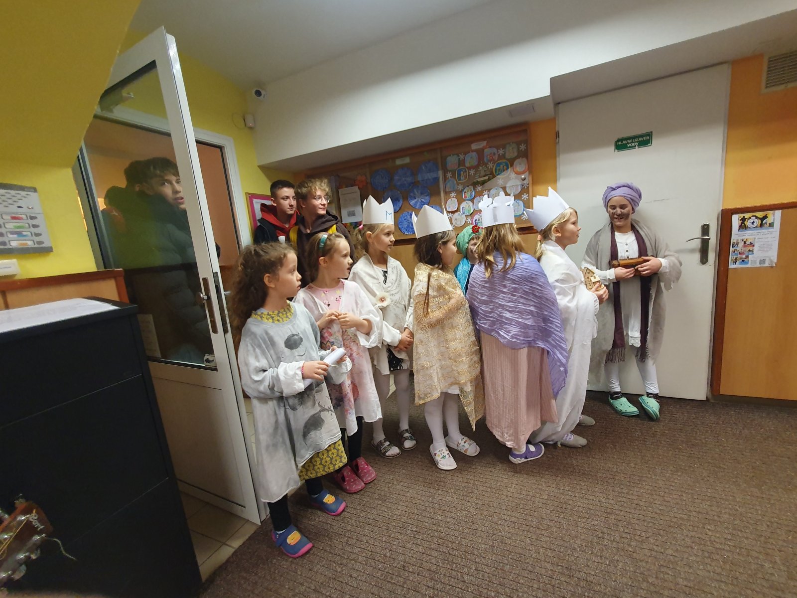 Zpívající party byly dvě a zpočátku se ve vinšování střídaly. Nakonec jsme to vyřešili po svém. Naše třídy a kanceláře navštěvovali hned dva Kašparové, dva Melicharové a dva Baltazarové současně. Ničemu a nikomu to nevadilo, protože všude mělo všech šest králů dveře otevřené. Zazpívali dokonce i rodičům ve vestibulu školy.