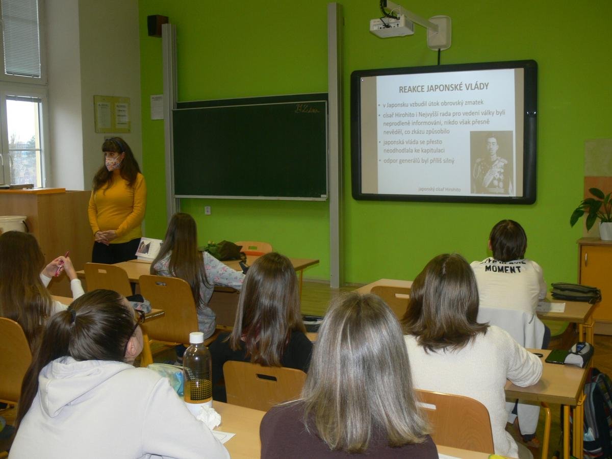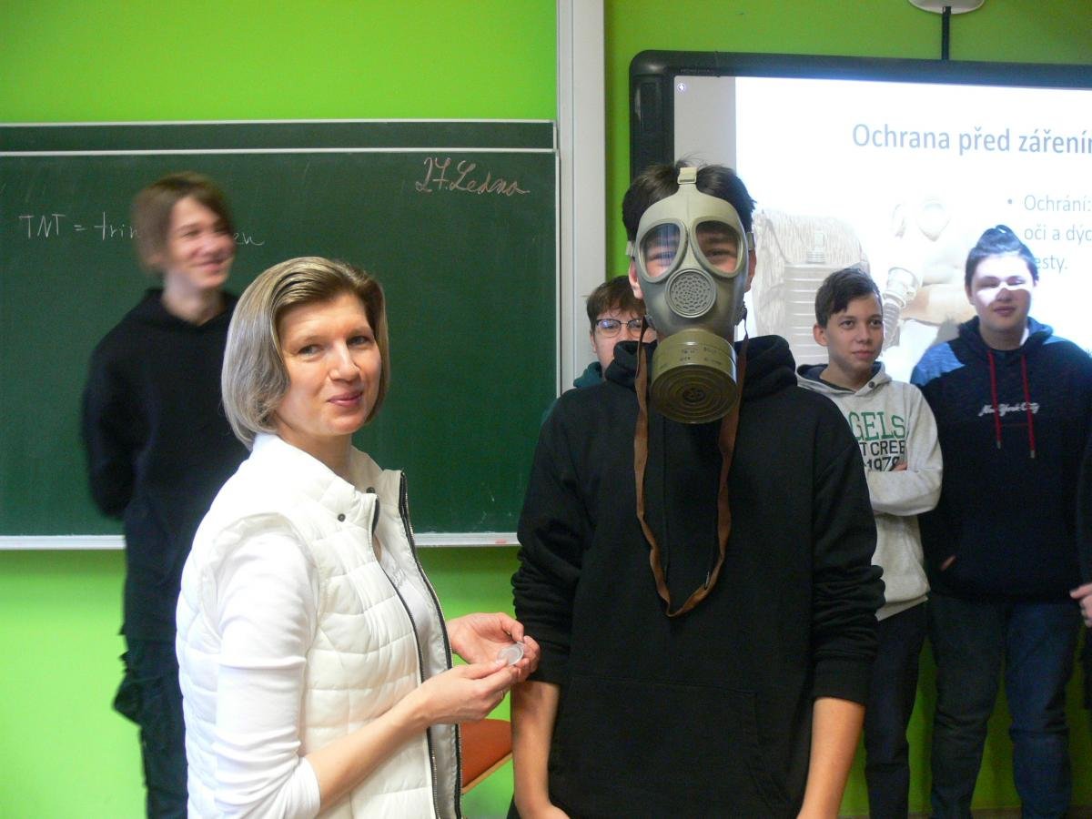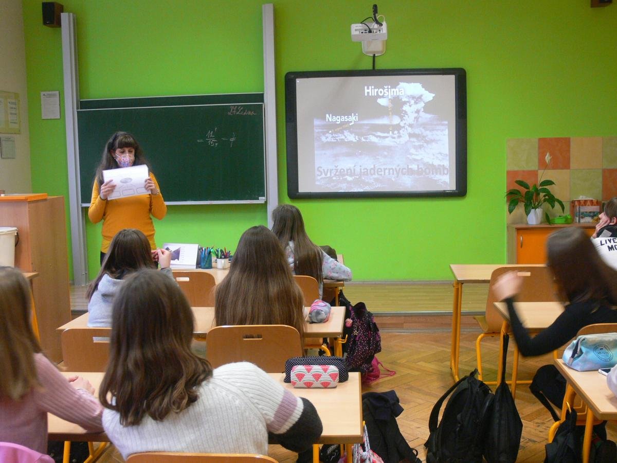 Na naší škole učíme v souvislostech napříč všemi předměty a rozvíjíme tím klíčové kompetence našich žáků. Co to však u nás znamená učit v souvislostech? Například žáci 9. ročníku aktuálně v dějepise „končí“ druhou světovou válku, ve fyzice řeší množství energie uvolněné při jaderné reakci a ze zeměpisu již znají polohu, přírodní poměry a zalidnění Japonska. Vyučující toho využili a připravili pro žáky společnou hodinu na téma, které se přímo nabízí a to - Svržení atomových bomb na Nagasaki a Hirošimu. Žáci tak měli možnost zamyslet se nad celou událostí z hlediska historie, fyziky i geografie a díky tomu ji lépe pochopit v souvislostech. Na závěr hodiny proběhla ukázka plynových masek, diskuze a zamyšlení nad hodnotou míru.