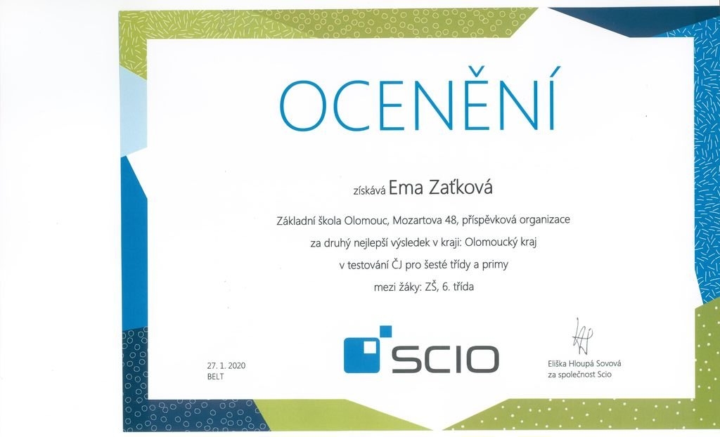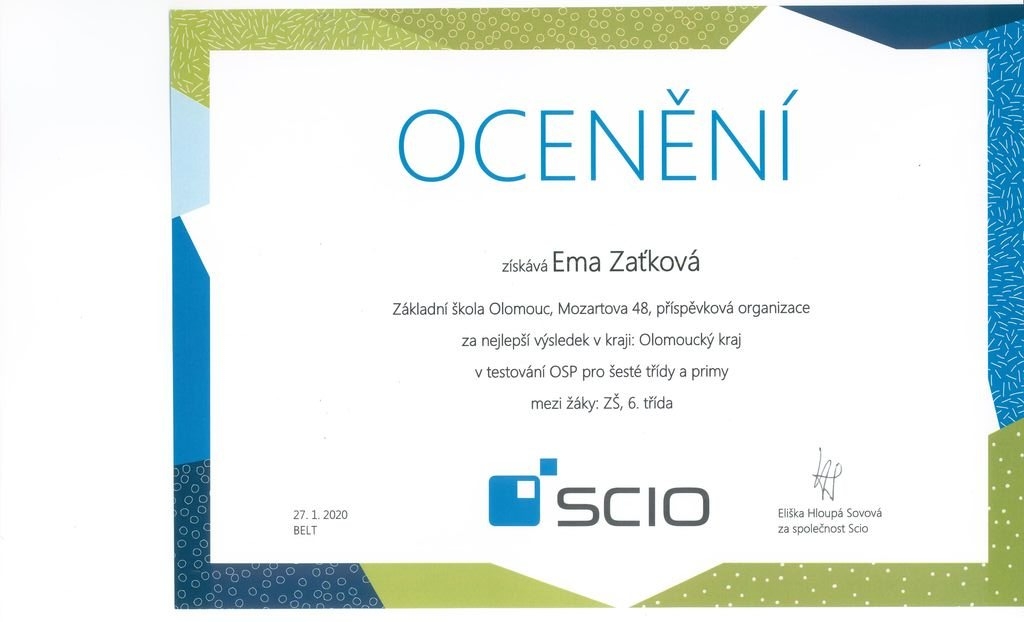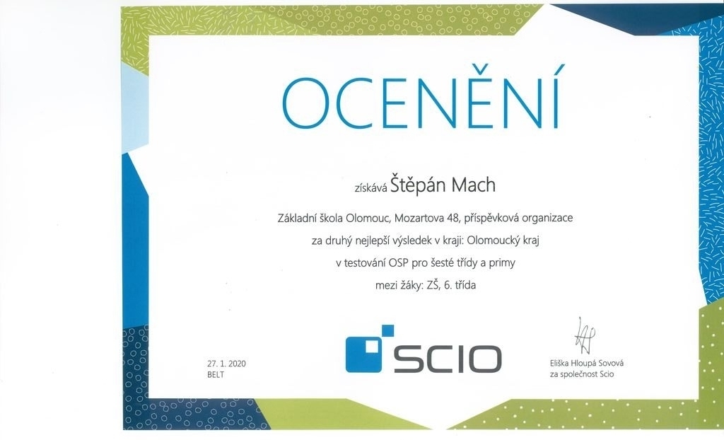 Je pro nás skvělou zprávou, že v naší škole studuje hned několik dětí, které patří mezi žáky s nejlepšími výsledky v Olomouckém kraji. Těmto nejúspěšnějším žákům jsme ze společnosti SCIO rádi předali zasloužená ocenění.