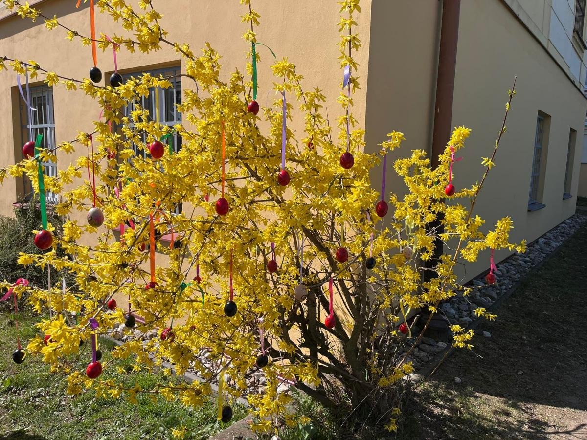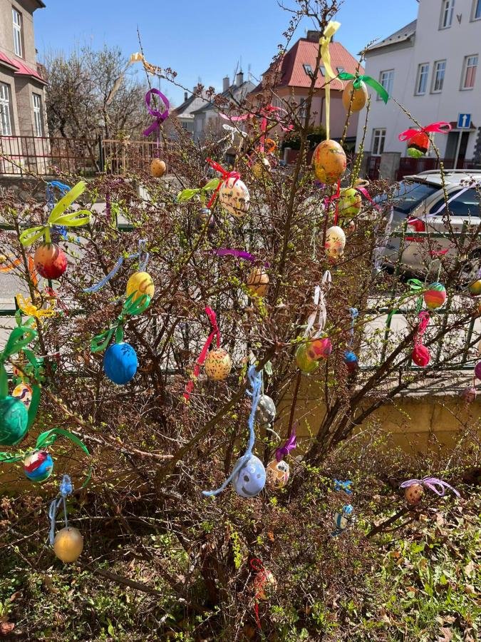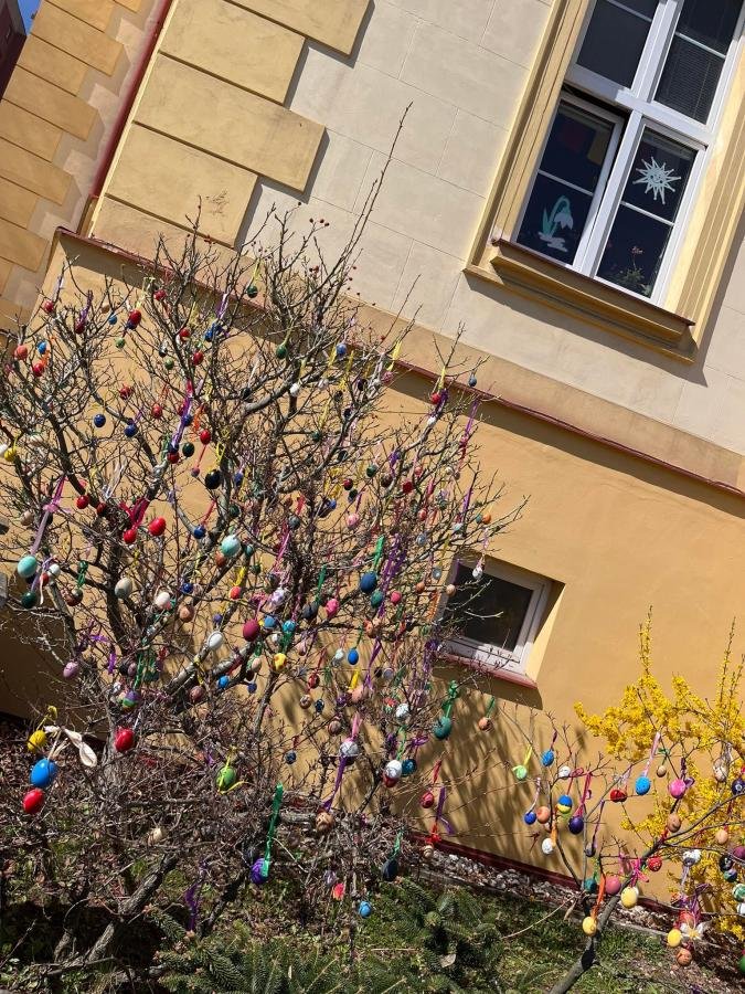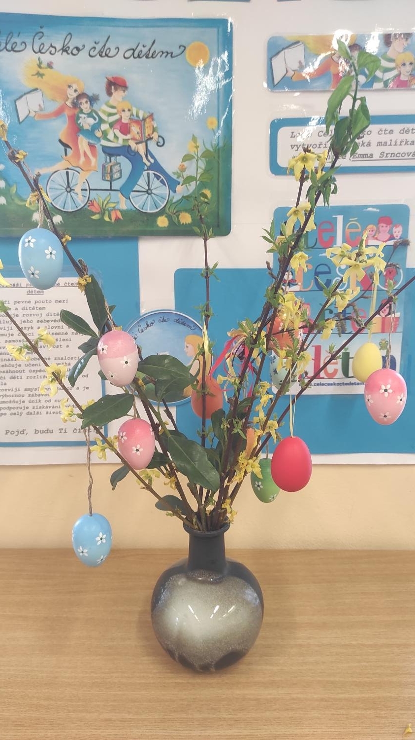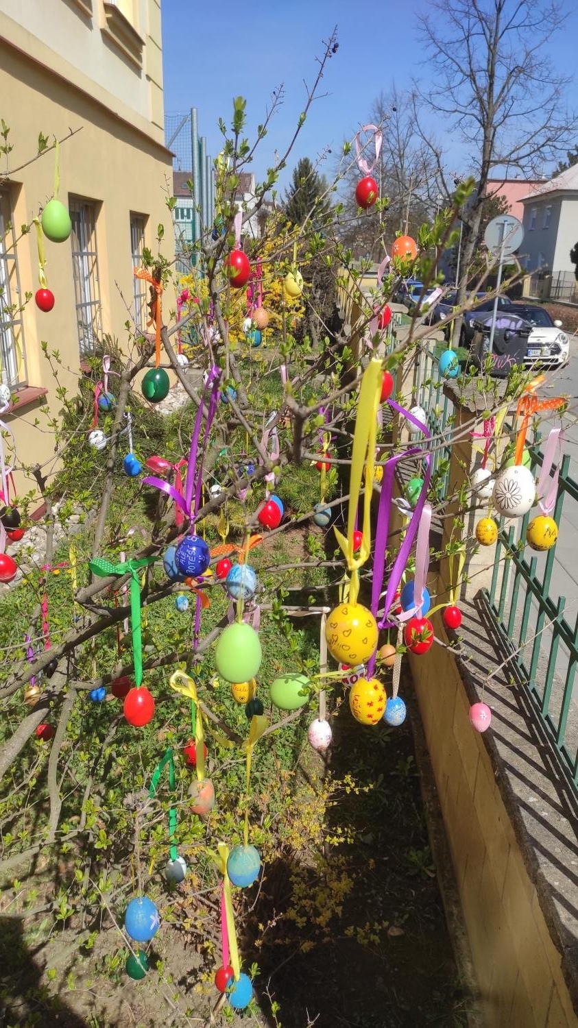 Ovšem hlavní hřeb tohoto týdne byla účast na soutěži v překonání rekordu ve zdobení velikonočních stromků před školou. Takže jsme všichni vyfukovali vajíčka jako o závod. Poté jsme vajíčka ozdobili a napsali na ně nějaký pozitivní vzkaz, jak stálo v podmínkách soutěže. Což bylo velice milé zpestření velikonočního zdobení, každý z nás se tak mohl zamyslet, jak je důležité udržet si pozitivní mysl a rozdávat radost. Našim dětem se letos povedlo vyvěsit 647 kraslic. Všichni jsme moc zvědaví na výsledky soutěže.