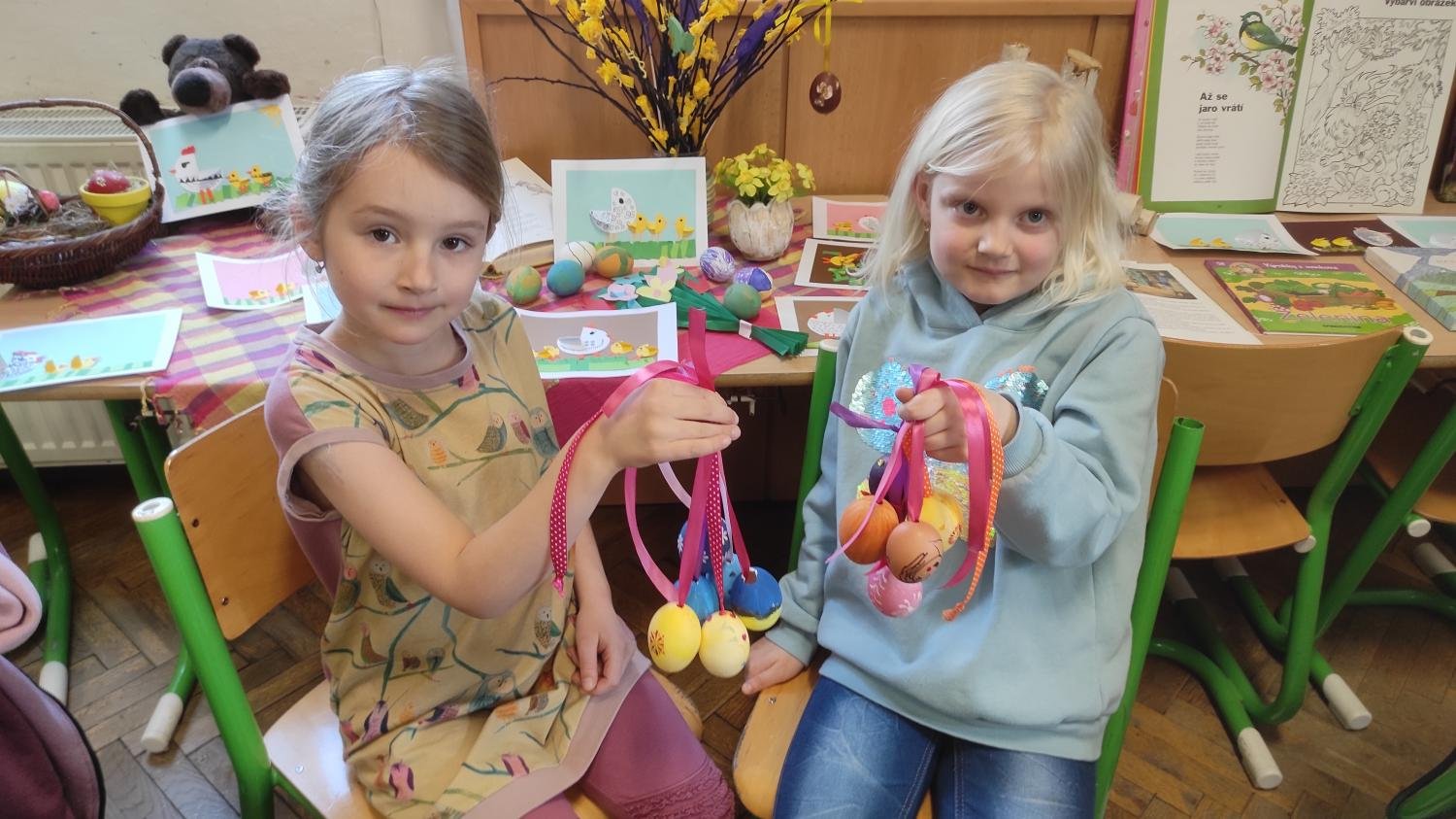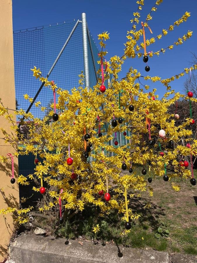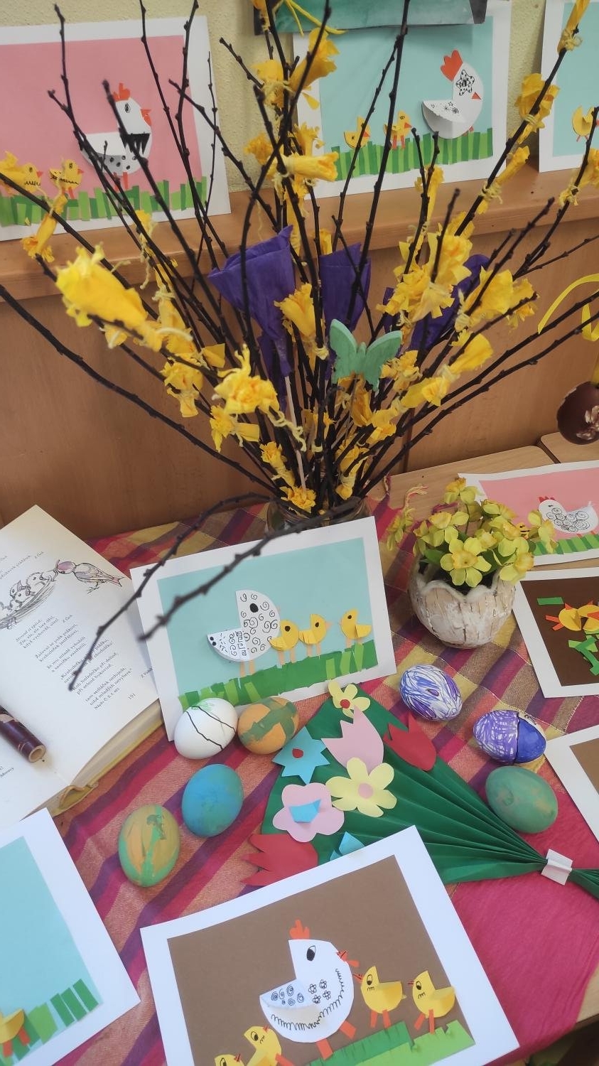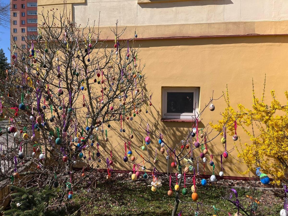 Ovšem hlavní hřeb tohoto týdne byla účast na soutěži v překonání rekordu ve zdobení velikonočních stromků před školou. Takže jsme všichni vyfukovali vajíčka jako o závod. Poté jsme vajíčka ozdobili a napsali na ně nějaký pozitivní vzkaz, jak stálo v podmínkách soutěže. Což bylo velice milé zpestření velikonočního zdobení, každý z nás se tak mohl zamyslet, jak je důležité udržet si pozitivní mysl a rozdávat radost. Našim dětem se letos povedlo vyvěsit 647 kraslic. Všichni jsme moc zvědaví na výsledky soutěže.