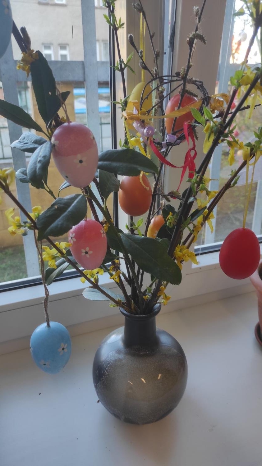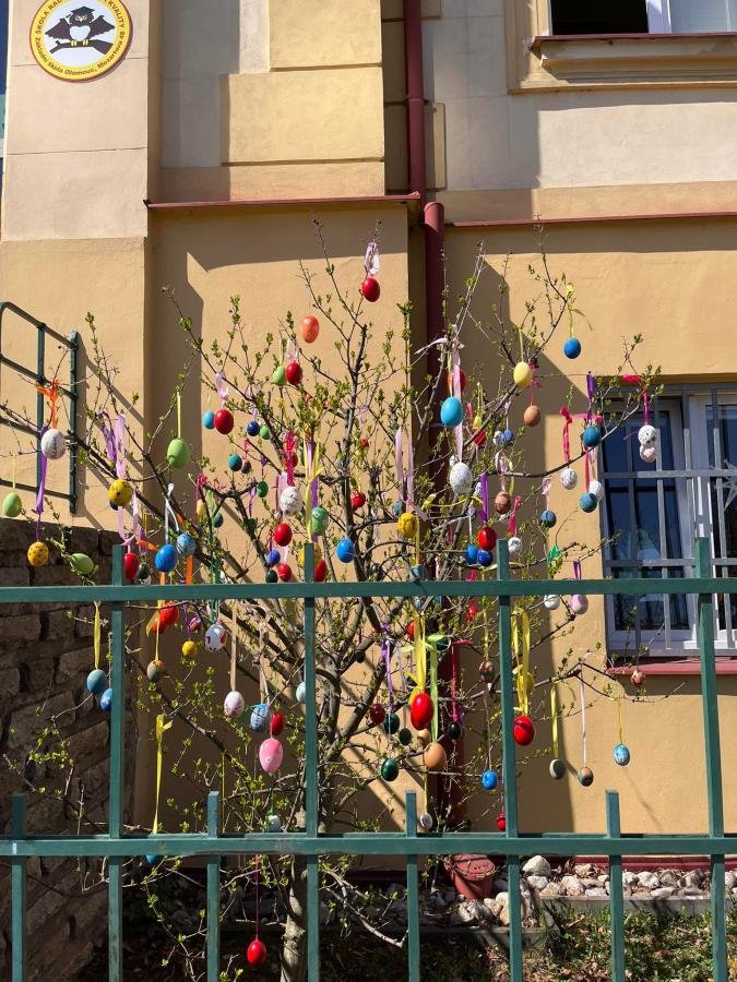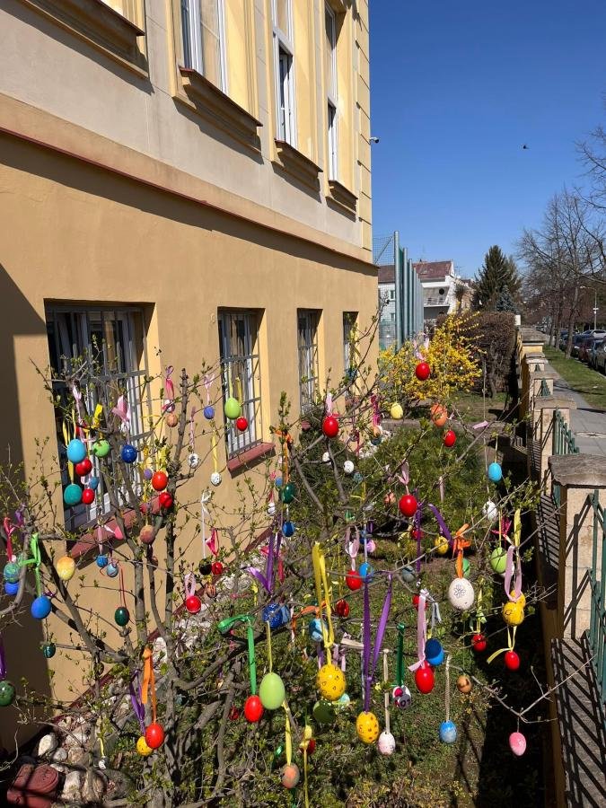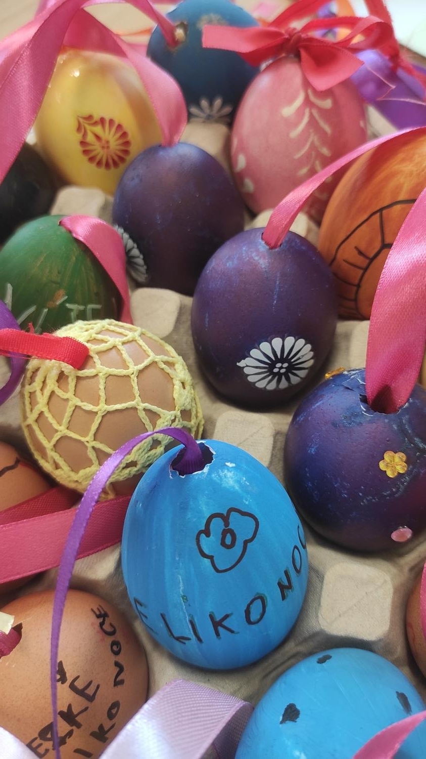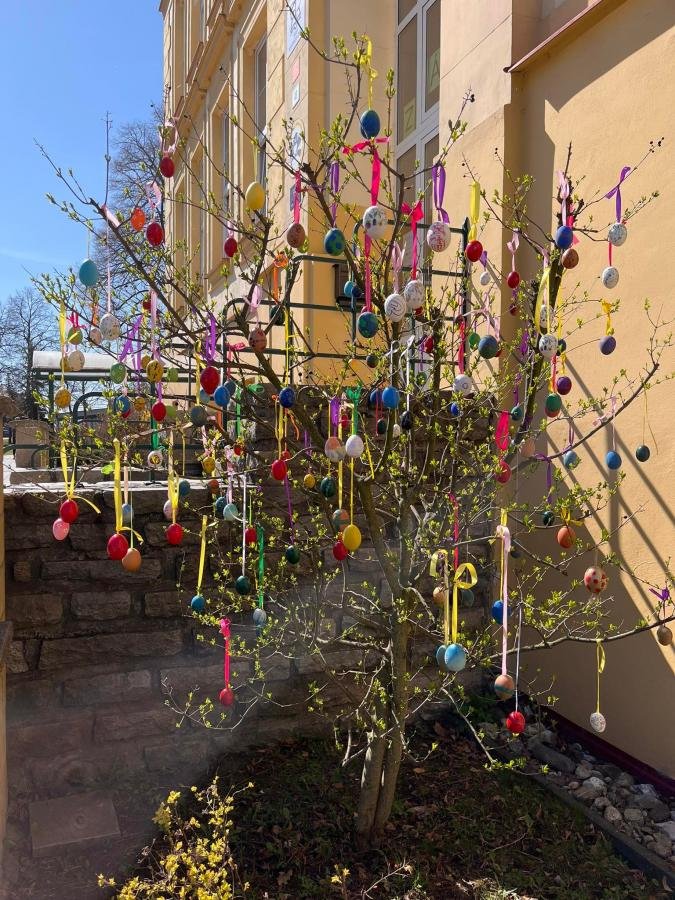Ovšem hlavní hřeb tohoto týdne byla účast na soutěži v překonání rekordu ve zdobení velikonočních stromků před školou. Takže jsme všichni vyfukovali vajíčka jako o závod. Poté jsme vajíčka ozdobili a napsali na ně nějaký pozitivní vzkaz, jak stálo v podmínkách soutěže. Což bylo velice milé zpestření velikonočního zdobení, každý z nás se tak mohl zamyslet, jak je důležité udržet si pozitivní mysl a rozdávat radost. Našim dětem se letos povedlo vyvěsit 647 kraslic. Všichni jsme moc zvědaví na výsledky soutěže.
