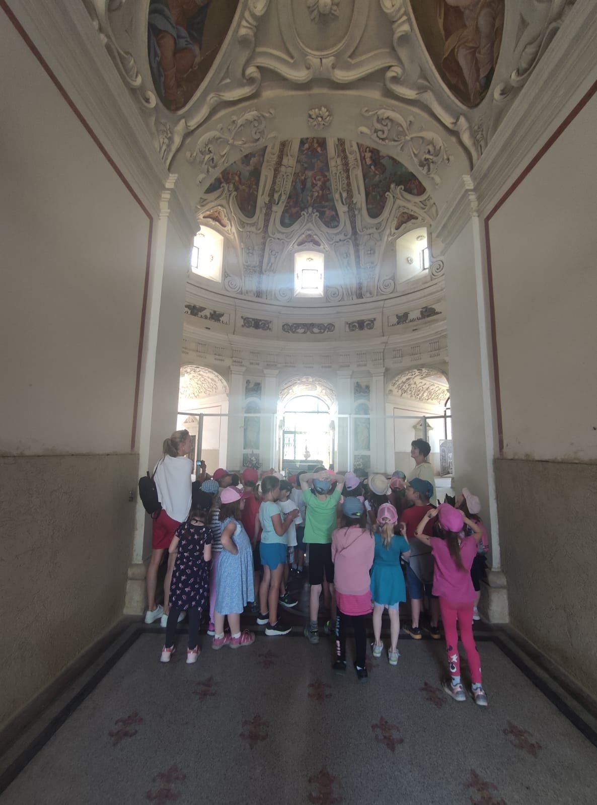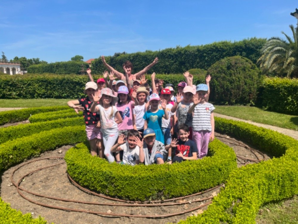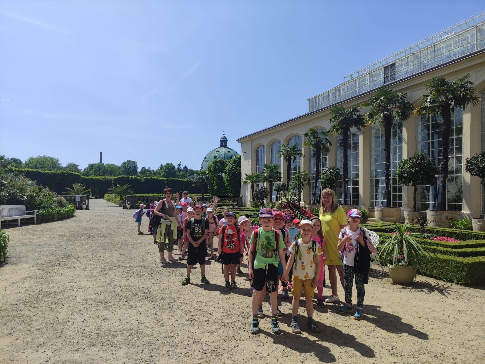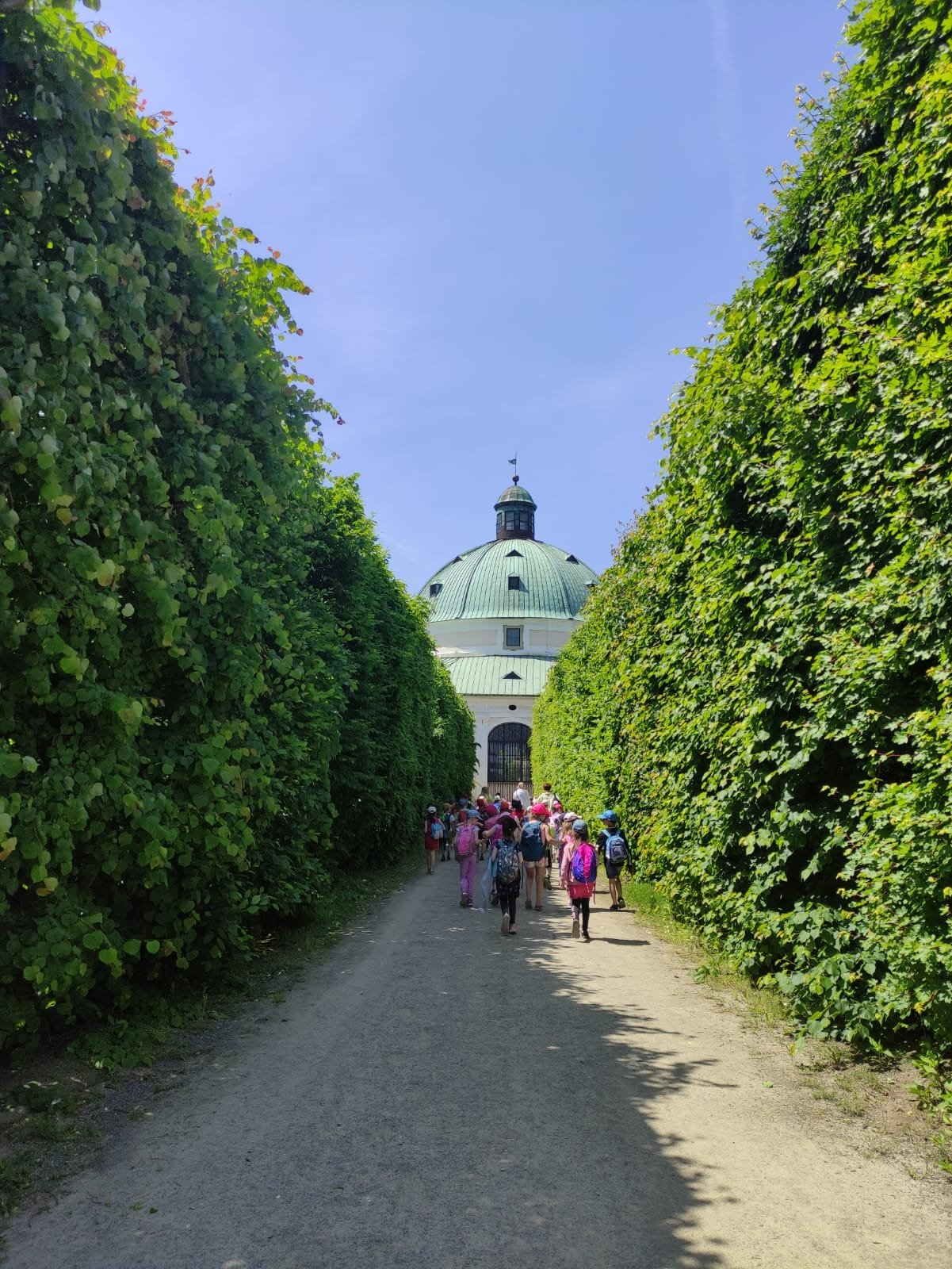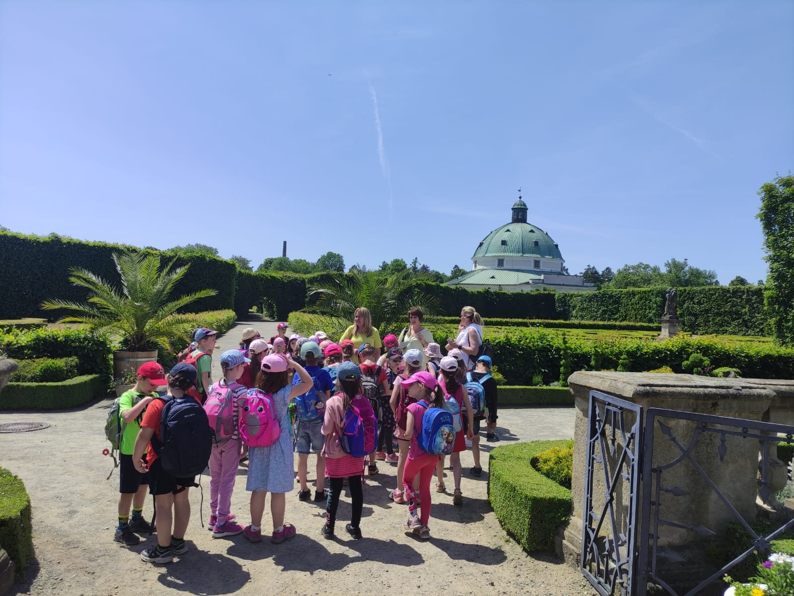 Poslední zastávka se konala v Květné zahradě. Obdivovali jsme nejen květinové záhony a arkády s vyhlídkou. Zábavu nám poskytlo i stromořadí habrů vysázených jako bludiště. Honička a schovávaná s paní učitelkou se všem moc líbila. Část dětí se zúčastnila i pokusu s ozvěnou u zahradního altánu.
