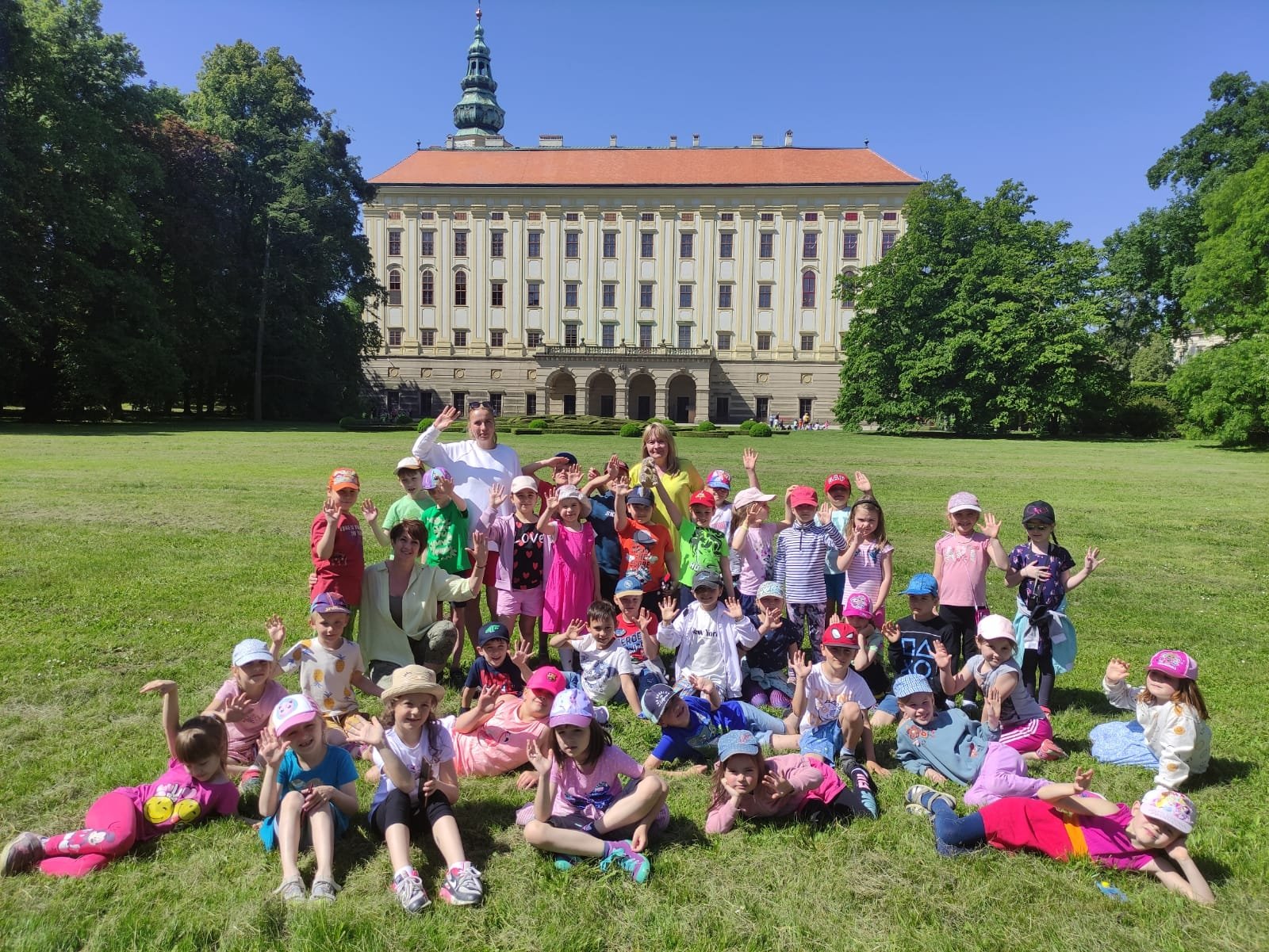 Z Milíčova náměstí, kde jsme se rozloučili s panem řidičem, jsme vyrazili k zámku. Podzámecká zahrada nám ukázala své krásy a poskytla zázemí pro svačinku. Prošli jsme se po cestičkách, zaběhali na louce, prohlédli zvířátka a vyfotili se v rozmanitých zákoutích.