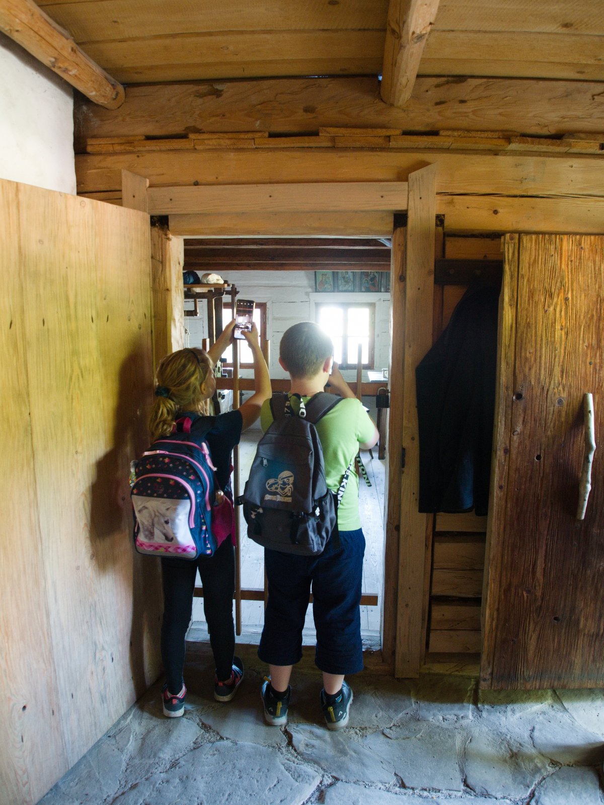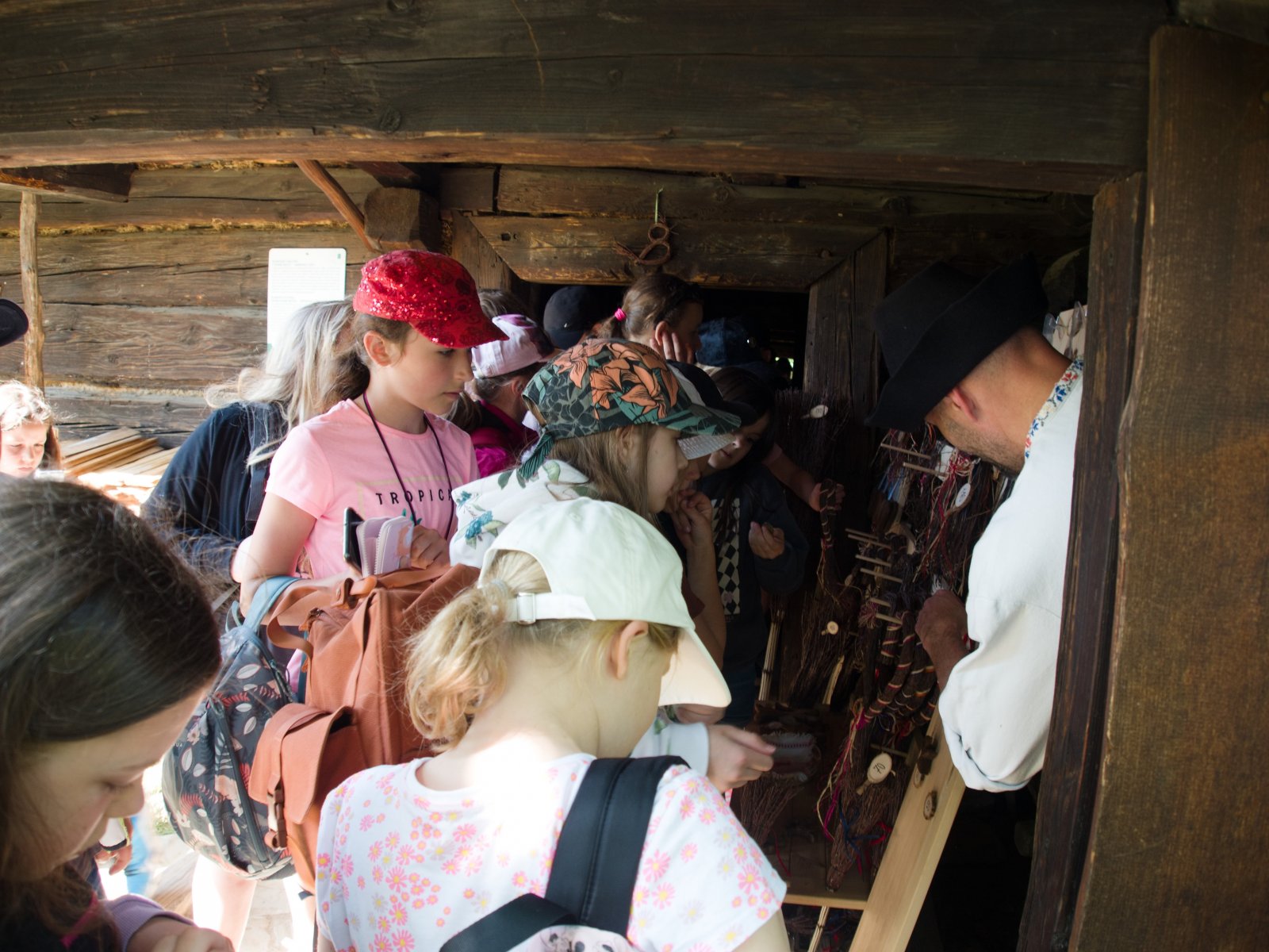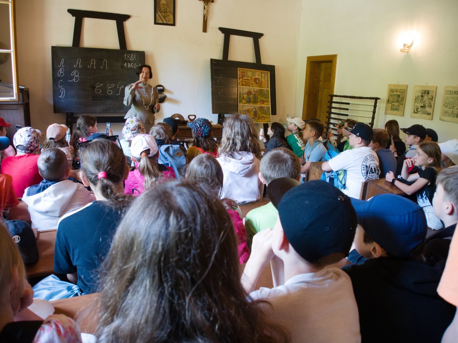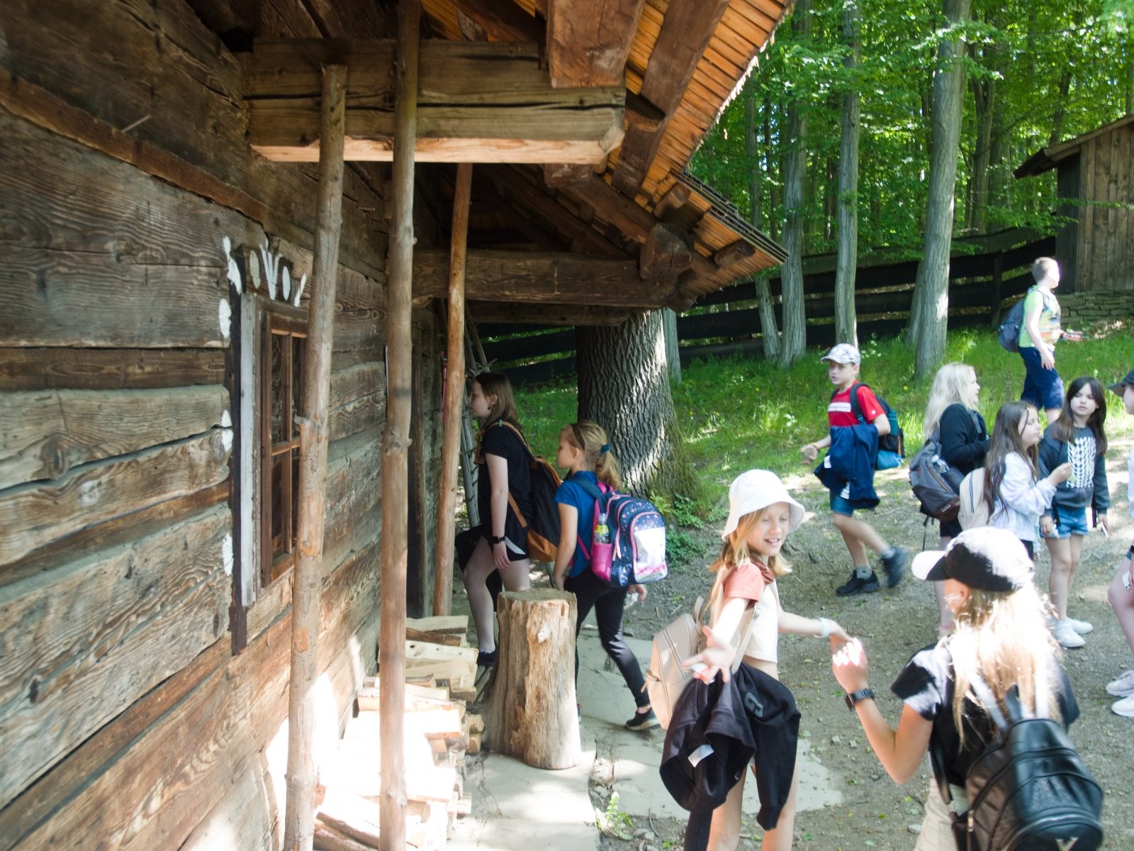 Avšak největším zážitkem byla místní dobová škola, kde na nás už čekala paní učitelka. Ukázala nám dřívější školní pomůcky, vybavení třídy a na tabuli psala původním psacím písmem. Dozvěděli jsme se, že v dřívějších dobách muselo každé z dětí přinést do školy polínko, aby bylo čím topit a nebyla ve třídě zima. Hodinu paní učitelka ukončila zazvoněním na velký zvonec. Ještě na nás čekala prohlídka Dřevěného městečka. Všichni jsme uvítali malé obchůdky a útulně zařízené chaloupky.