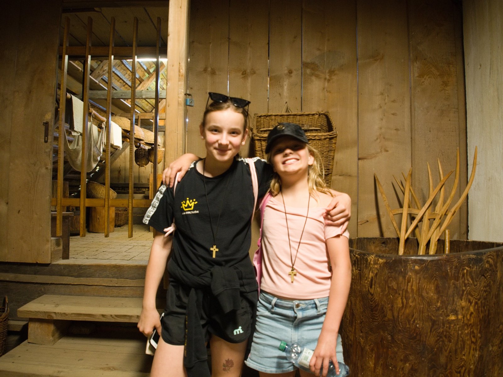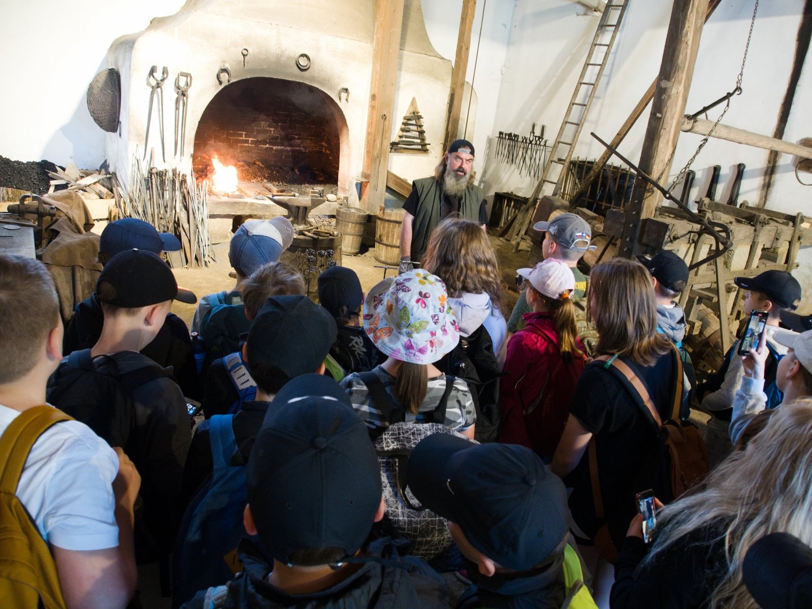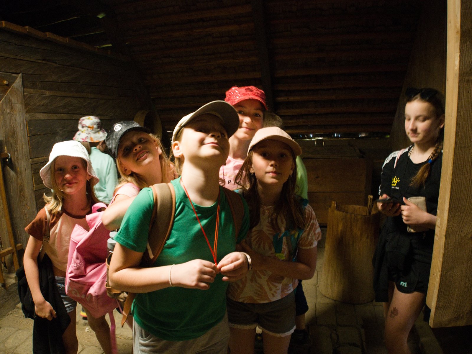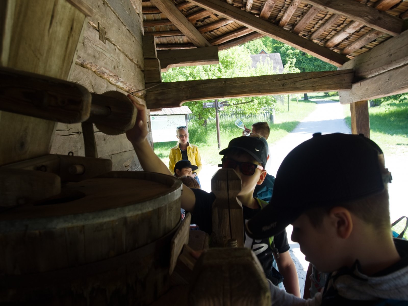 Avšak největším zážitkem byla místní dobová škola, kde na nás už čekala paní učitelka. Ukázala nám dřívější školní pomůcky, vybavení třídy a na tabuli psala původním psacím písmem. Dozvěděli jsme se, že v dřívějších dobách muselo každé z dětí přinést do školy polínko, aby bylo čím topit a nebyla ve třídě zima. Hodinu paní učitelka ukončila zazvoněním na velký zvonec. Ještě na nás čekala prohlídka Dřevěného městečka. Všichni jsme uvítali malé obchůdky a útulně zařízené chaloupky.