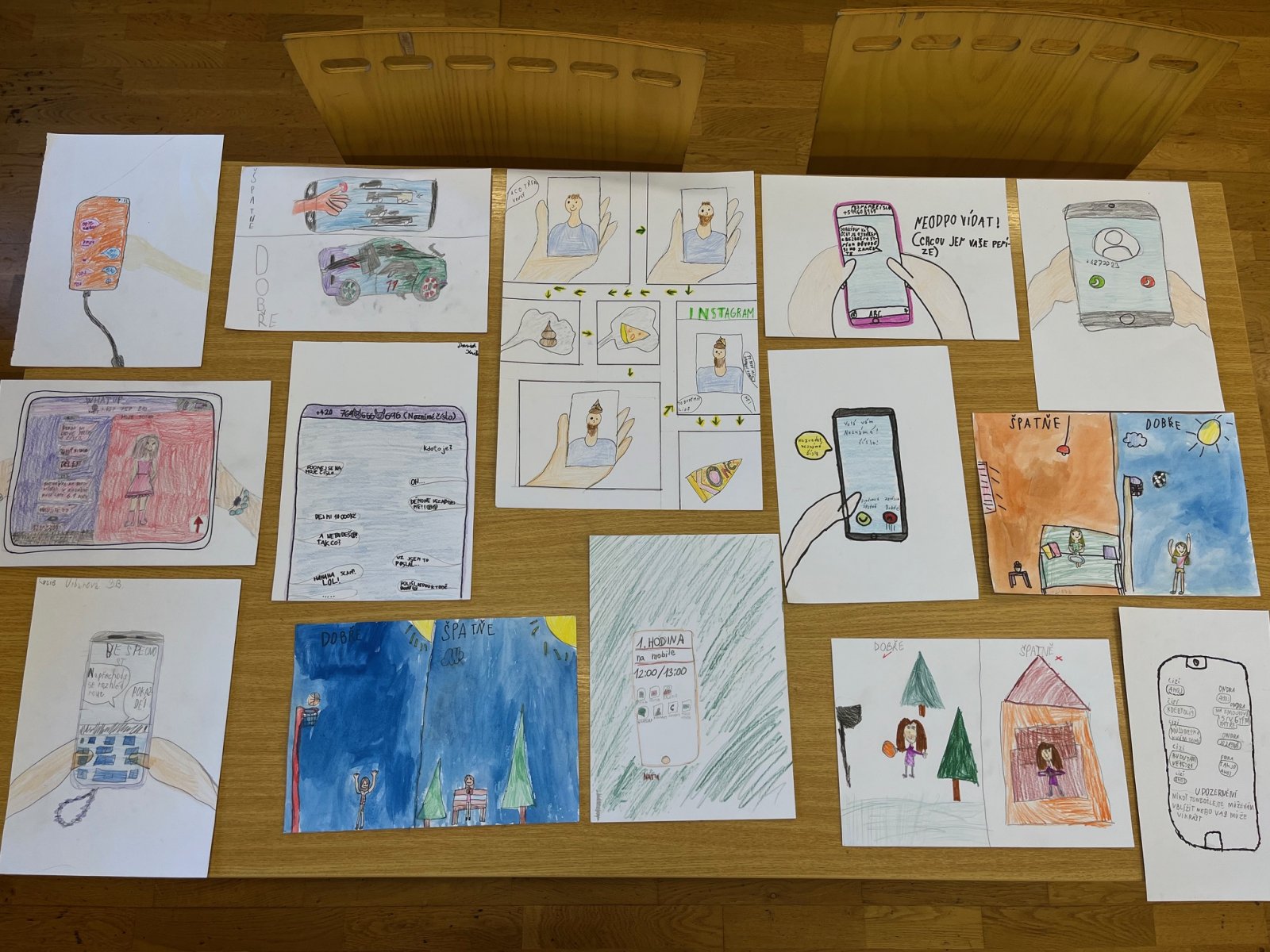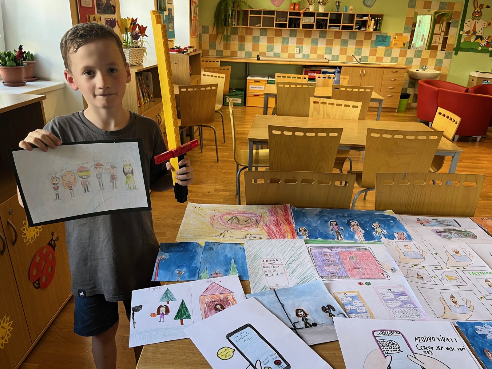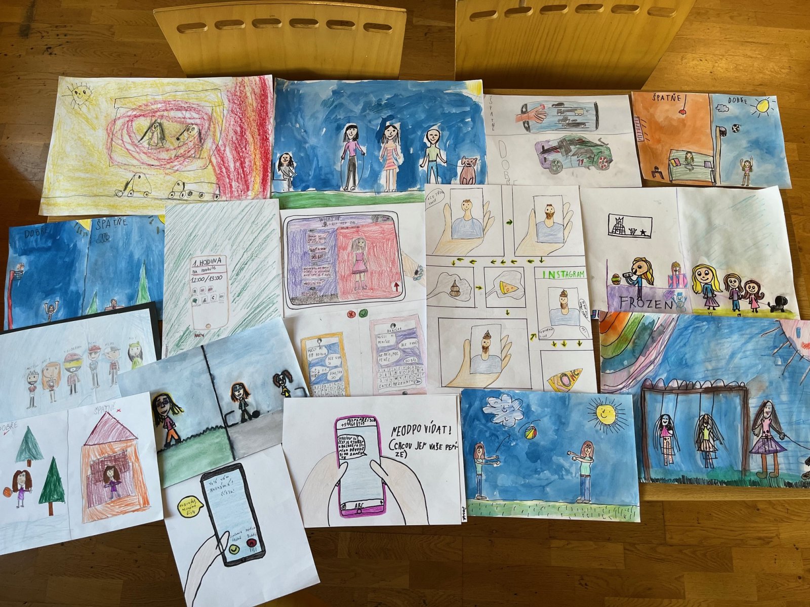 Děti se zamýšlely nad tématem a diskutovaly o jednotlivých problémech. Nejčastějším námětem pro výtvarné práce bylo ztvárnění úvahy - „Jít ven, bavit se s přáteli, nebo chatovat sám v pokoji a hrát online hry“. Povídaly si také o tom, jaký by byl svět bez mobilu a internetu nebo o bezpečném chování v digitálním světě.