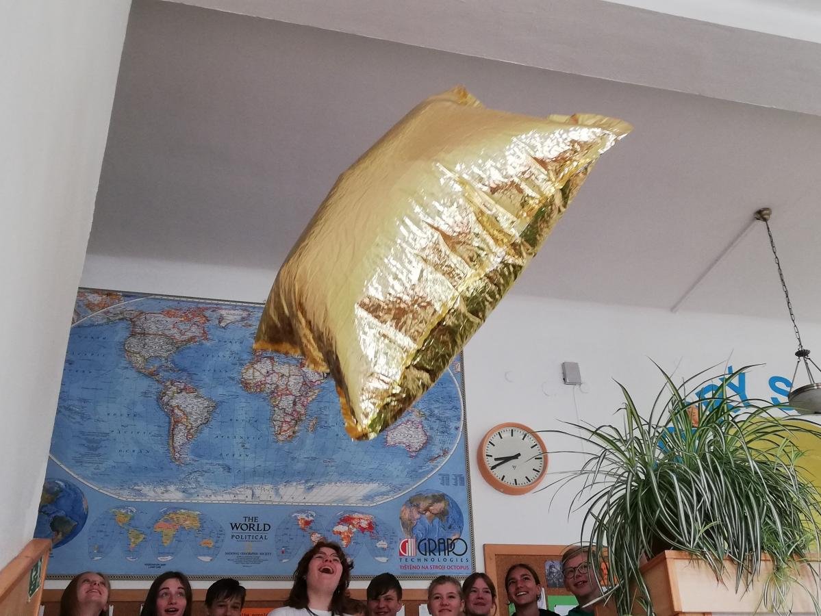 Jeden z dalších experimentů žákům dokázal, že i v atmosféře platí Archimédův zákon. Toto jsme si demonstrovali pomocí horkovzdušného balónu, který se nám vznesl až ke stropu chodby. Prostě fyzika hrou.